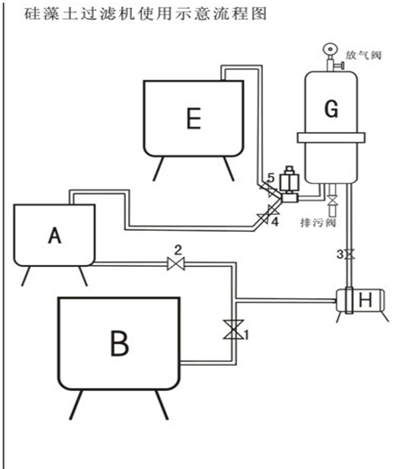 2 上土。將150公斤左右的未過(guò)濾的酒放在A桶里,如果是330過(guò)濾機(jī)加2.5公斤的硅藻土在A桶里攪拌均勻,如果是400過(guò)濾機(jī)加3公斤硅藻土在A桶里,再打開(kāi)閥門(mén)2.3.4,關(guān)閉閥門(mén)1.5,然后啟動(dòng)飲料泵H,此時(shí)容器A內(nèi)的渾液通過(guò)泵從3進(jìn)口輸入過(guò)濾機(jī),渾液中的硅藻土也隨之進(jìn)入機(jī)內(nèi),附著在過(guò)濾布上,經(jīng)過(guò)出口閥4回到酒桶A,形成循環(huán)。循環(huán)15分鐘左右從過(guò)濾機(jī)的玻璃觀察孔處如果看到酒變清澈了,這時(shí)說(shuō)明所有的硅藻土已經(jīng)粘附到在過(guò)濾機(jī)的濾布上,形成了一道過(guò)濾層,這一過(guò)程叫“上土”,上土完成后就可以進(jìn)行正式過(guò)濾。